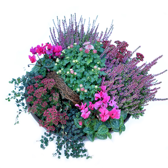 Bepflanzt mit Alpenveilchen, Heide, Chrysanthemen und Rebhuhnbeere, Durchmesser ca. 45 cm